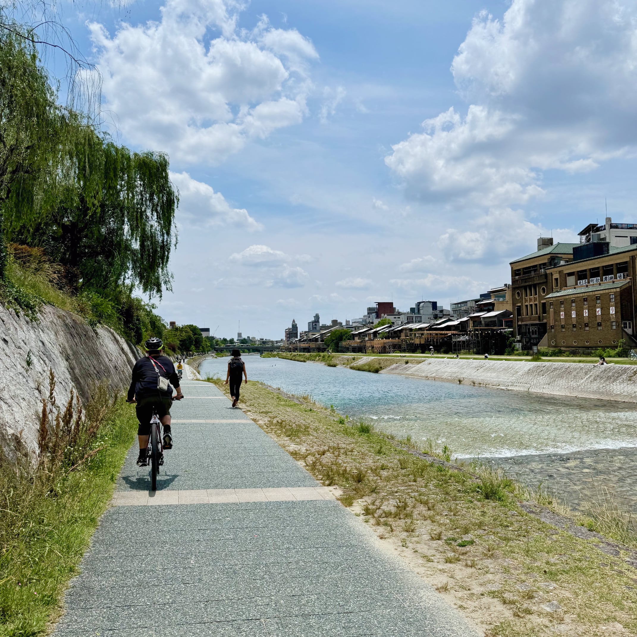 ランチの後は鴨川の河川敷を南下。そぞろ歩きの散歩やはしゃぐ観光客で賑う牧歌的な小路が続く。自転車でもゆっくりペダルを漕ぐのがちょうど良い。京都駅近くの塩小路に至って小休憩。このあたりは再開発地域で、金網が巡らされた更地を走るのはダーク・ツーリング的。高瀬川沿いを北上し、三条通りの手前でライドを終える。終盤の木屋町通は次第に混雑し、午後の用務への世俗感が強まっていった。