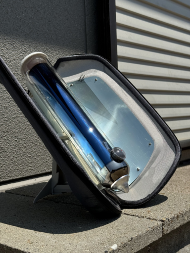 夏の日差しをポジティブに捉えてみる。以前購入したソーラークッカー「GoSun」のパッケージを引っ張り出し、試してみることにした。手始めに、シンプルにお湯を沸かすことにする。ガラス管の容量は420mlあり、水をギリギリまで注ぐ。