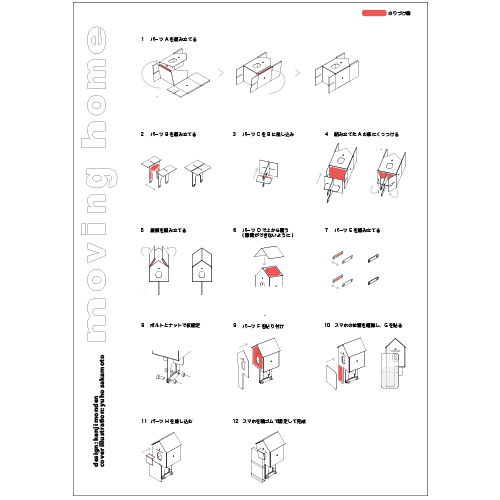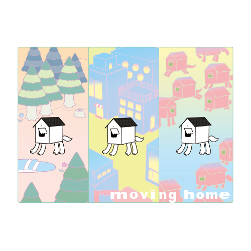 イラストには4本の足と尻尾が生えた犬のような家が描かれているが、これは筆者が指定したものではなく、キットを体験した漫画家が自ら描き上げたものである。彼女は「犬になってしまった」と語っていたが、このイラストは「動くこと」をうまく表現しており、さらに「動くこと」が本質であるならば、自転車でなくても良いのではないかという「moving home」の今後の展開を示唆しているように感じたため、採用することにした。