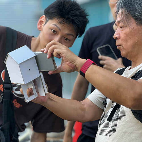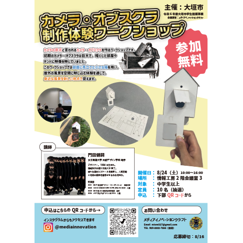 このワークショップは、写真の原点である「カメラオブスクラ」を作成し、身近な風景を新しい視点で捉えることを目的としている。初期のカメラオブスクラは巨大で、暗い部屋やテントに映像を映し出すものだったが、今回のワークショップでは、小さな箱を使い、屋外の風景を空間に映し込むことで、身近な風景を新たな視点から体験できるようにした。ただし、このワークショップで使用したキットは、筆者が大学院時代から展開している「自転車建築」から派生したもので、一般的なカメラオブスクラ体験とは一味違う内容となっている。