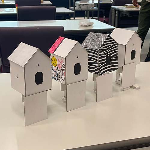 組み立てが終わった後は、色鉛筆やペンを使ってそれぞれの「moving home」をデザインしてもらい、その後、外に出て各自で様々な映像を撮影した。