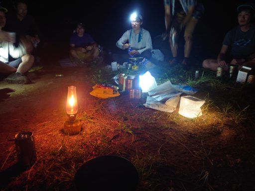 まだ明るい午後6時半、自分たちはキャンプ地に到着、他の参加者各位と合流した。もっと遅くなった人もちらほら。今回は北海道、新潟、関西各府県、東京、埼玉などから、旧中山道のあっち側やこっち側なんかを駆け抜け、総勢15名を超える面々が集まった。林間サイトに様々な軽量シェルターが並び、中央には宴席が形成された。旅のことやルートのこと、さらには生活上のあれこれに至るまで、話題は尽きず、涼しい森の夜は更けていった。