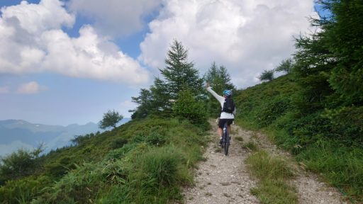 ピークの先は素晴らしい眺望に恵まれたトレイルが少々、それからアスファルト舗装の車道となっていた。獲得した位置エネルギーを解放し、ブラインドコーナーなのにやたらと突っ込んでくる対向自動車のドライバーの神経を疑いながら、自転車に人間が乗って進む時間を楽しむ。もう安心、余裕、と極楽気分でいたらどっこい、ちょっとした登り返しで右脚の内転筋が攣った。そーっと漕いでも歩いてもビキビキ。うおーやばい、と思って水と電解質タブレットを補給し少しストレッチしたら解消、再発なし。