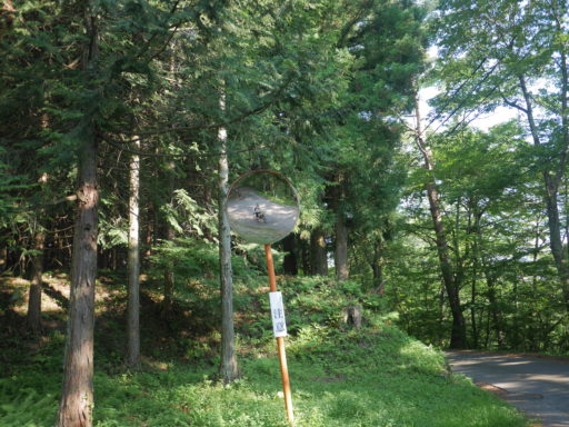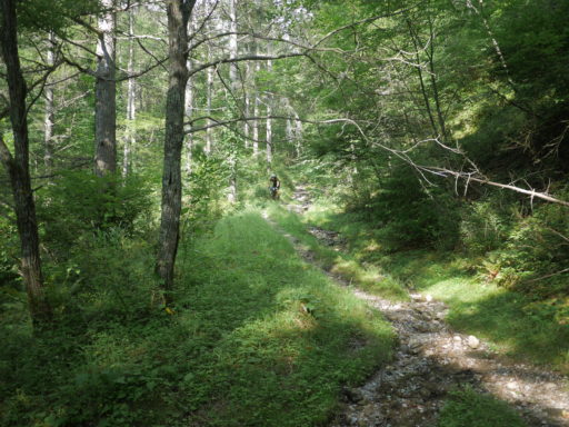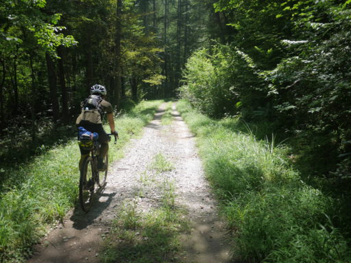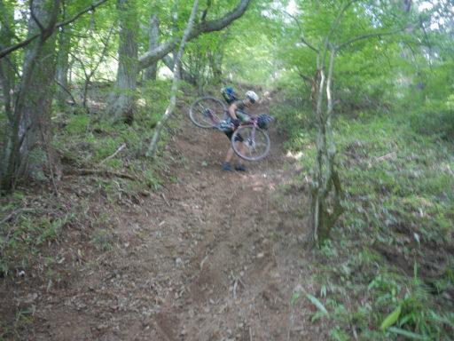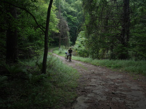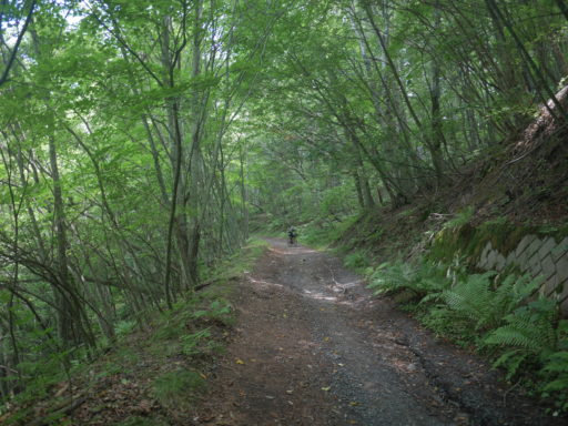 「林道」をひとしきり下ると、一般的な意味における林道との交差ポイントに出た。そこを過ぎるとしばらく登りになり、やがて再び峠へ向かって標高を減らしていくようだった。ちょっとうんざりし始めていた自分たちは、交差する林道の方にルートを切り替えて先ほどの舗装路に復帰することに。この林道も斜度こそぐっと緩やかになるものの、雨の時には川床になる(あるいはかつてなっていた)に違いないガレた路面のため乗車のチャンスは多くなかった。