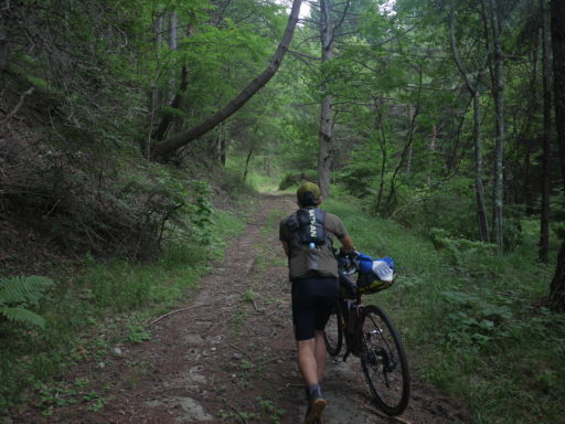 でも基本的にずっと登坂で、平坦なトラバース区間はごくわずかだったと記憶している。舗装区間では特に「作業」感が強まり、体力の消耗の少ない押し歩きを選ぶことが増えた(自分の場合、速度もそう変わらない)。