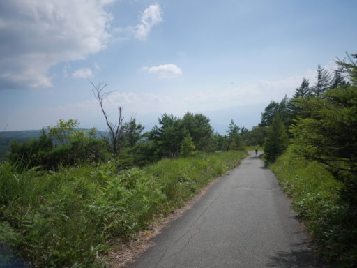 信州とはいえ盆地の市街はむわっと暑かったのに対し、林道は涼しいとまではいかなくても快適だった。場所によって微風が吹き抜け、二人して喜んだ。