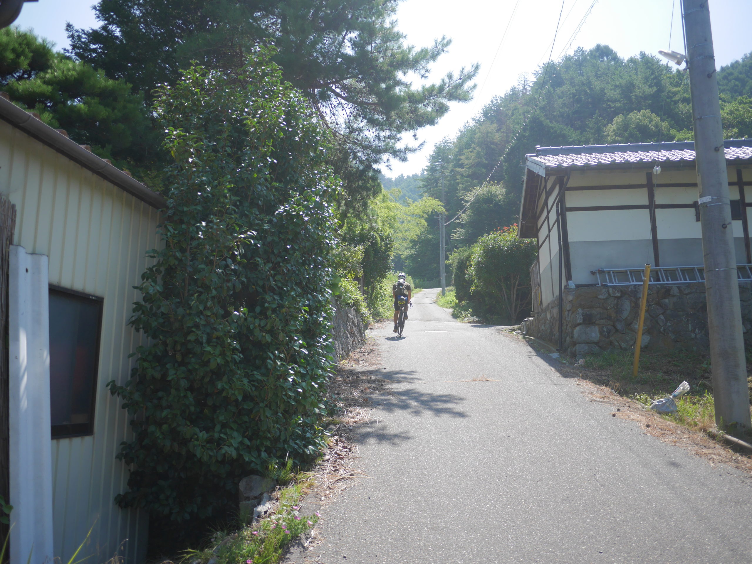駅でたけひーと合流、輪行解除してコンビニでの買い物を済ませ、市街中心部から10分ほど走って山の取っ付きに至る。目当ての林道へは、村落を抜ける一本道を登る。地図(Google Mapsの平面)上で蛇行していないので緩やかに谷を詰めていくものと思いきや、これが普通に激坂だった。