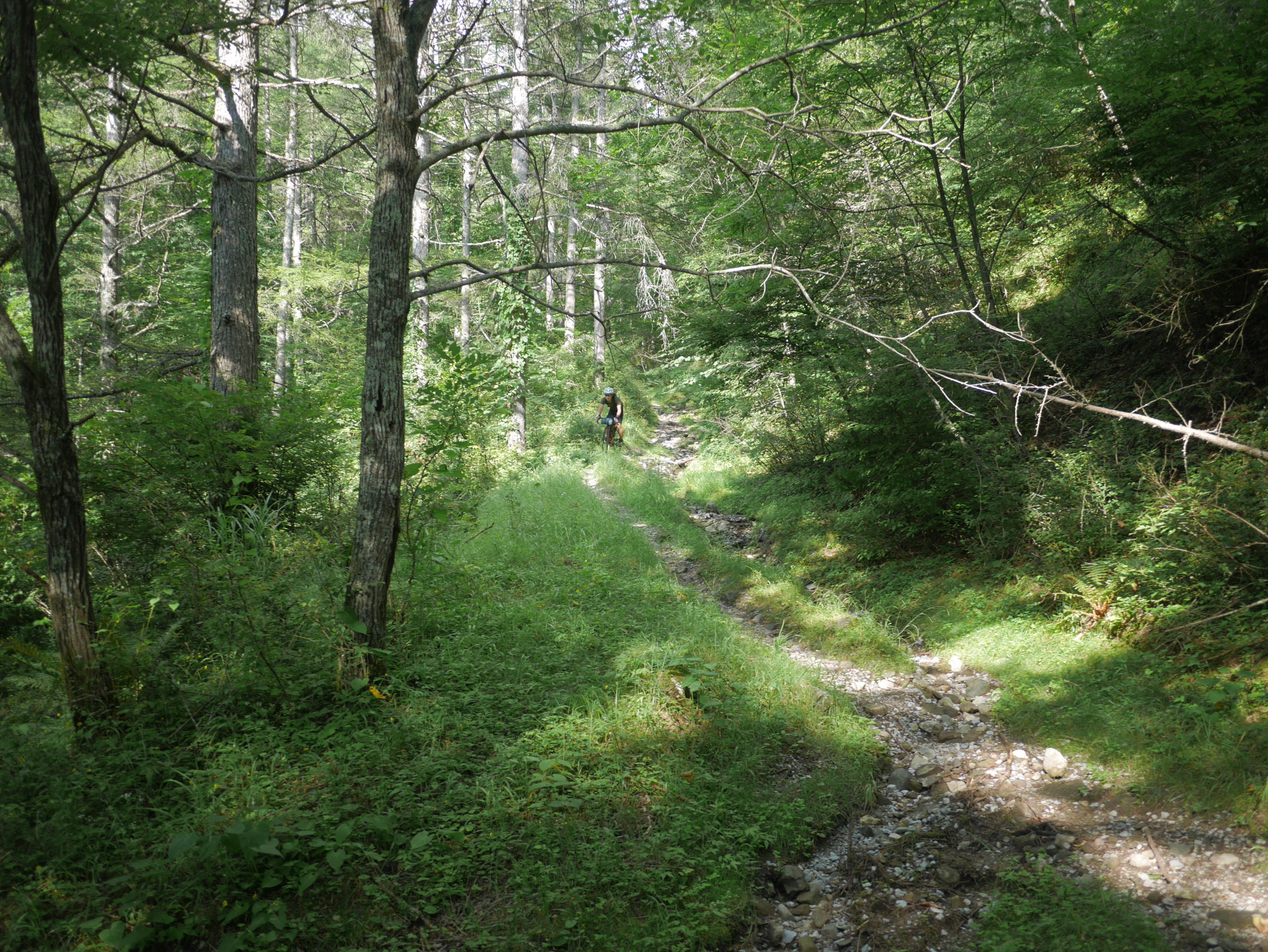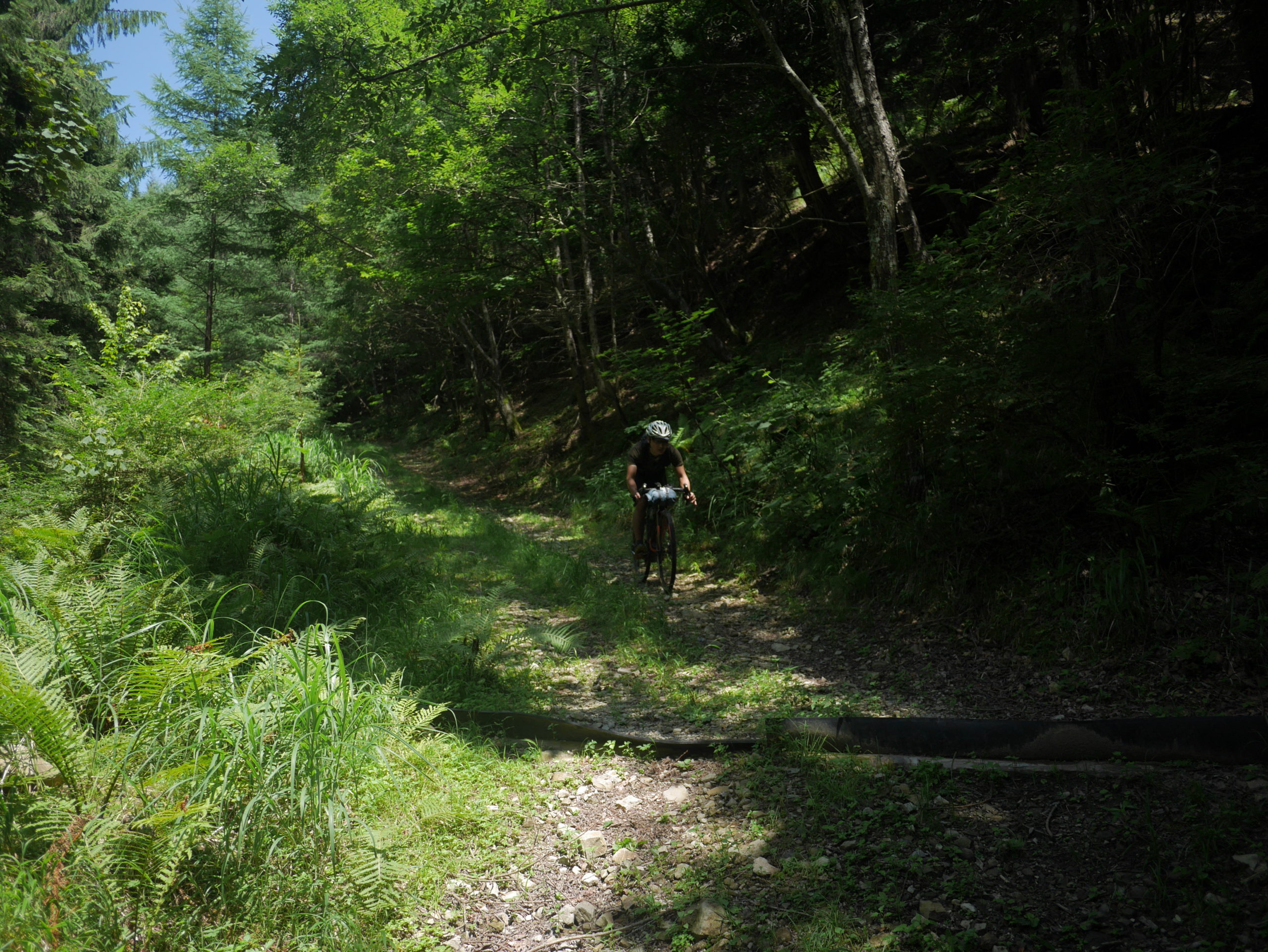 「林道」をひとしきり下ると、一般的な意味における林道との交差ポイントに出た。そこを過ぎるとしばらく登りになり、やがて再び峠へ向かって標高を減らしていくようだった。ちょっとうんざりし始めていた自分たちは、交差する林道の方にルートを切り替えて先ほどの舗装路に復帰することに。この林道も斜度こそぐっと緩やかになるものの、雨の時には川床になる(あるいはかつてなっていた)に違いないガレた路面のため乗車のチャンスは多くなかった。