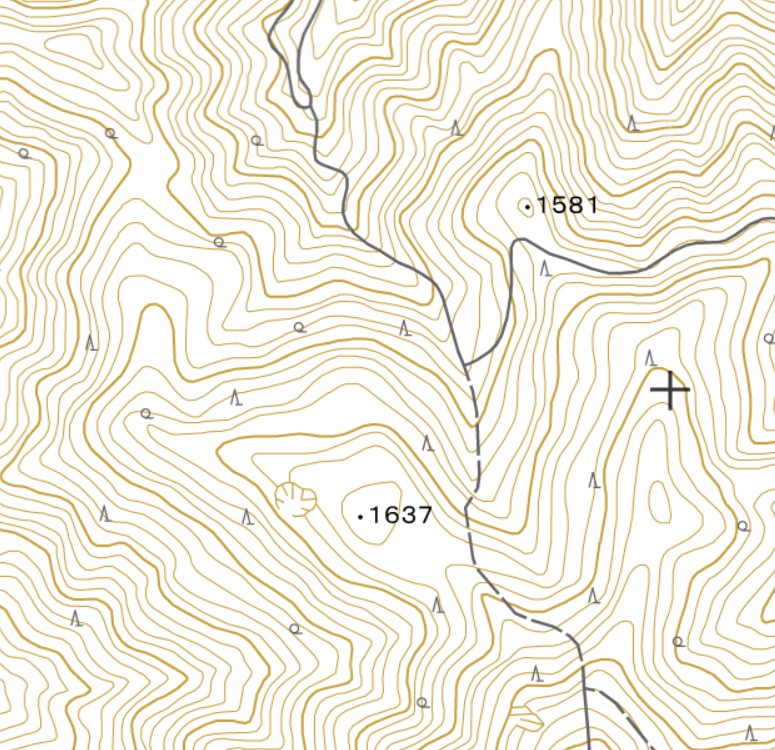 序盤は沢を源頭へ辿っていく形で、シダ類の繁茂するやや広い谷は既存とされるルートを読むのが難しかった。恐らく現行の道は地理院地図の点線とは少し違うところを走っている。ある程度まで登って沢の始まりの窪み(ごく浅く、涸れている)を過ぎたところで、尾根筋、ただし鞍部より先のところへ、針葉樹(たぶん落葉松)の林を直登気味にジグザクで上がることにした。枯れた枝葉の堆積した林床はフカフカで歩きにくく(そういうものだ)、林業用と思しき踏み跡を掴んでも、途中で曖昧になったり思った方へ行っていなかったりする。