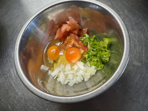 まず、機器と付属のシリコントレーを30分ほど予熱する。具材のトマト、ピーマン、玉ねぎをみじん切りにする。クッカーが温まったら、卵と具材を撹拌し、トレーに流し入れる。
