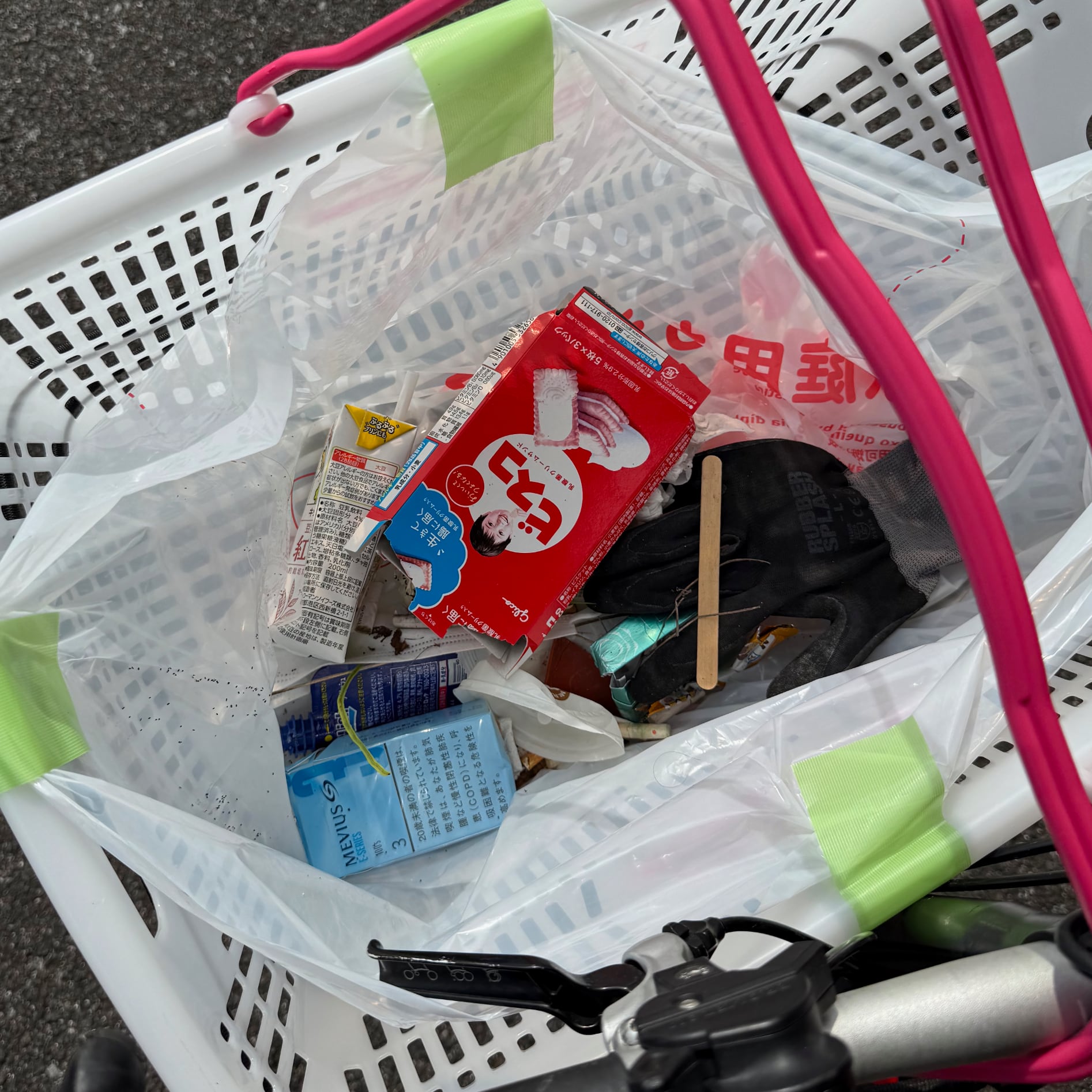 自分史上もっとも暑かった夏が終わりそうで終わらない9月末の朝、自転車に乗ってゴミ拾いをした。そのためにスーパー・マーケットの買い物カゴにゴミ袋を入れ、養生テープで留める。カゴの取っ手をBromptonのハンドルに通し、荷台用のゴム紐で固定する。これで長めのトングを入れればゴミ収集車の完成。同行した知人はフード・デリバリー用の巨大バックにゴミ袋を入れて背負う。