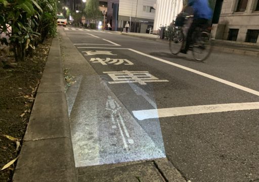 東京の制作では、いつも利用している小型プロジェクター(200ルーメン)が街の明るさに負けてしまったため、JMGOのレーザープロジェクターを前籠に乗せ、背負ったバッテリーから給電しながら制作を行った。
