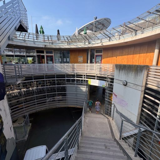 朝、フライブルクの駅前に小畑さんがカーゴ・バイクUrban Arrowで登場。筆者は荷台に載っていたBromptonをお借りして走り出す。まずは歩行者・自転車の専用橋を渡って駅の反対側へ。そこは大きなリング・タワーの駐輪場。2段のラックに整然と自転車が並び、内周部は大型自転車が置ける。カフェや自転車ショップ、自転車レンタル、自転車ツアー・デスクなどが併設され、多くの人で賑わっている。