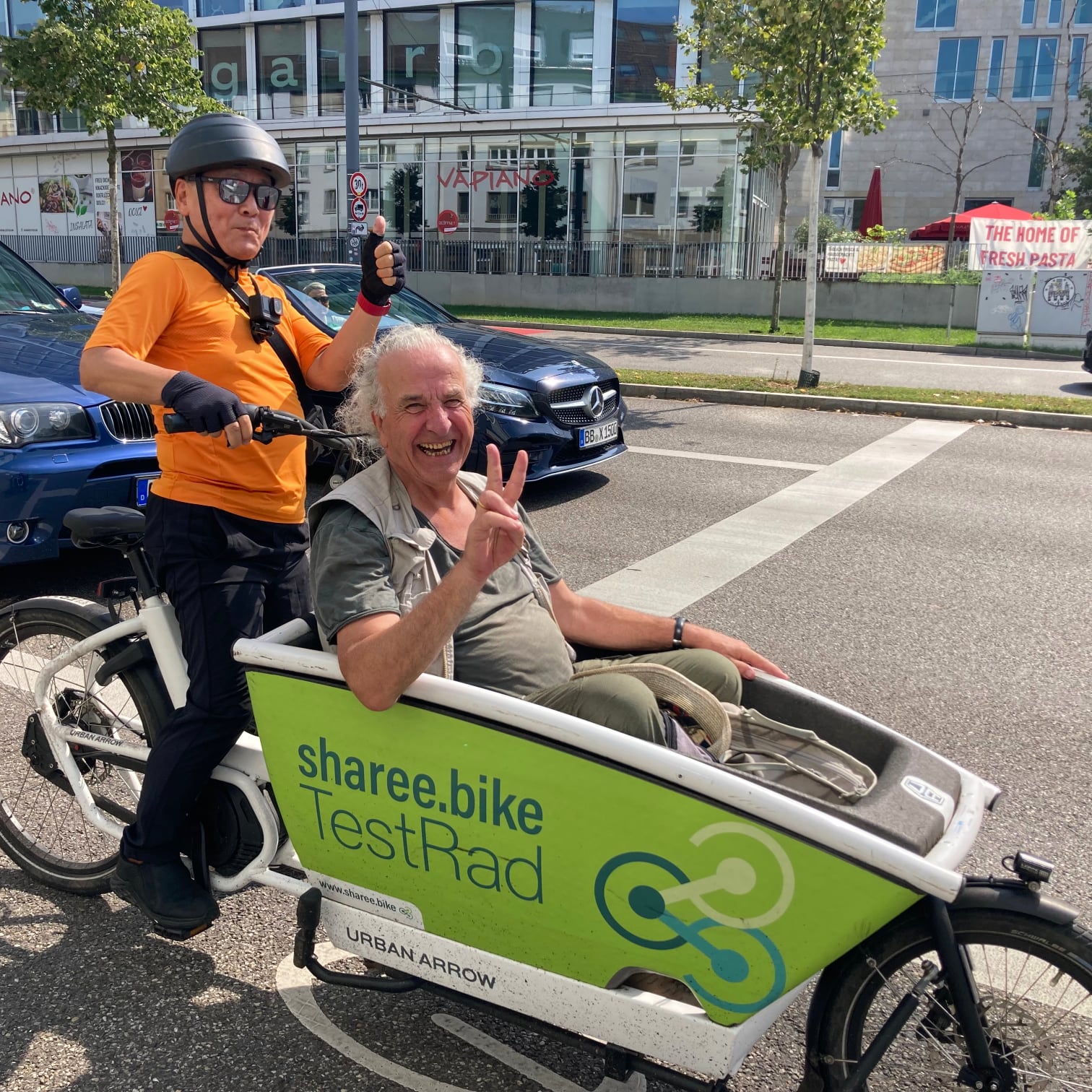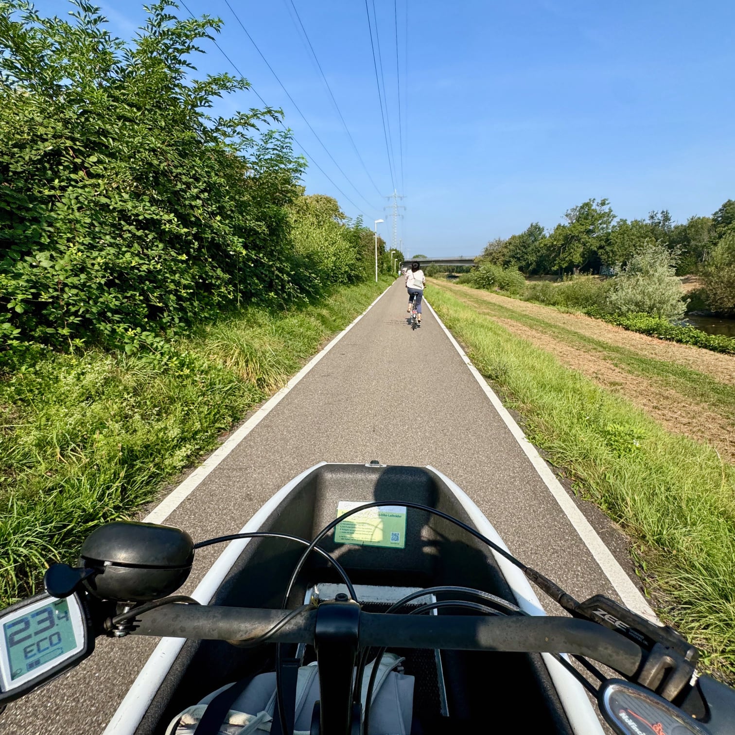 旧市街の後は、余興ながら知人の大柄なドイツ人をカーゴに乗せて駅前に戻る。総重量は200kg近いはずで、流石に漕ぎ出しがふらついてしまう。走り出せば安定しているものの、慣性が大きいのでブレーキの制動力に不安を覚える。それでもなんとか走り通せたのは、整備された道路のおかげだろう。これが東京なら、すぐに事故になりそうだ。