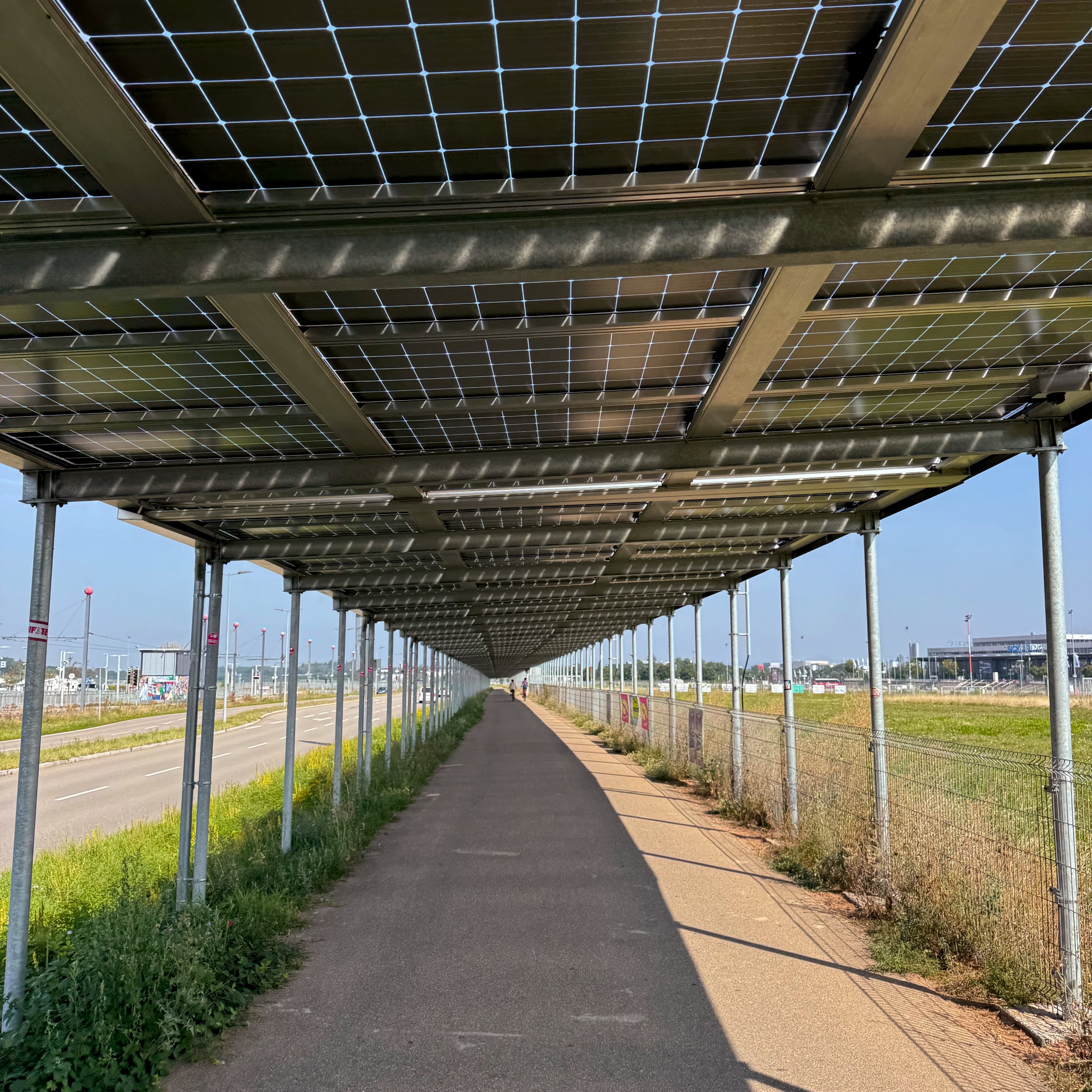 この日は休日だったこともあって、快晴の空の下、さまざまな自転車に乗った人と行き交う。川辺で水遊びをする人や公園で寛ぐ人も多い。小畑さんのルート選定のおかげもあって、快適に流れるように街を巡る。自転車レーンは明確で、スムースに右折や左折できる。物理的に分離された自転車道やソーラー・パネルを屋根にした箇所もある。