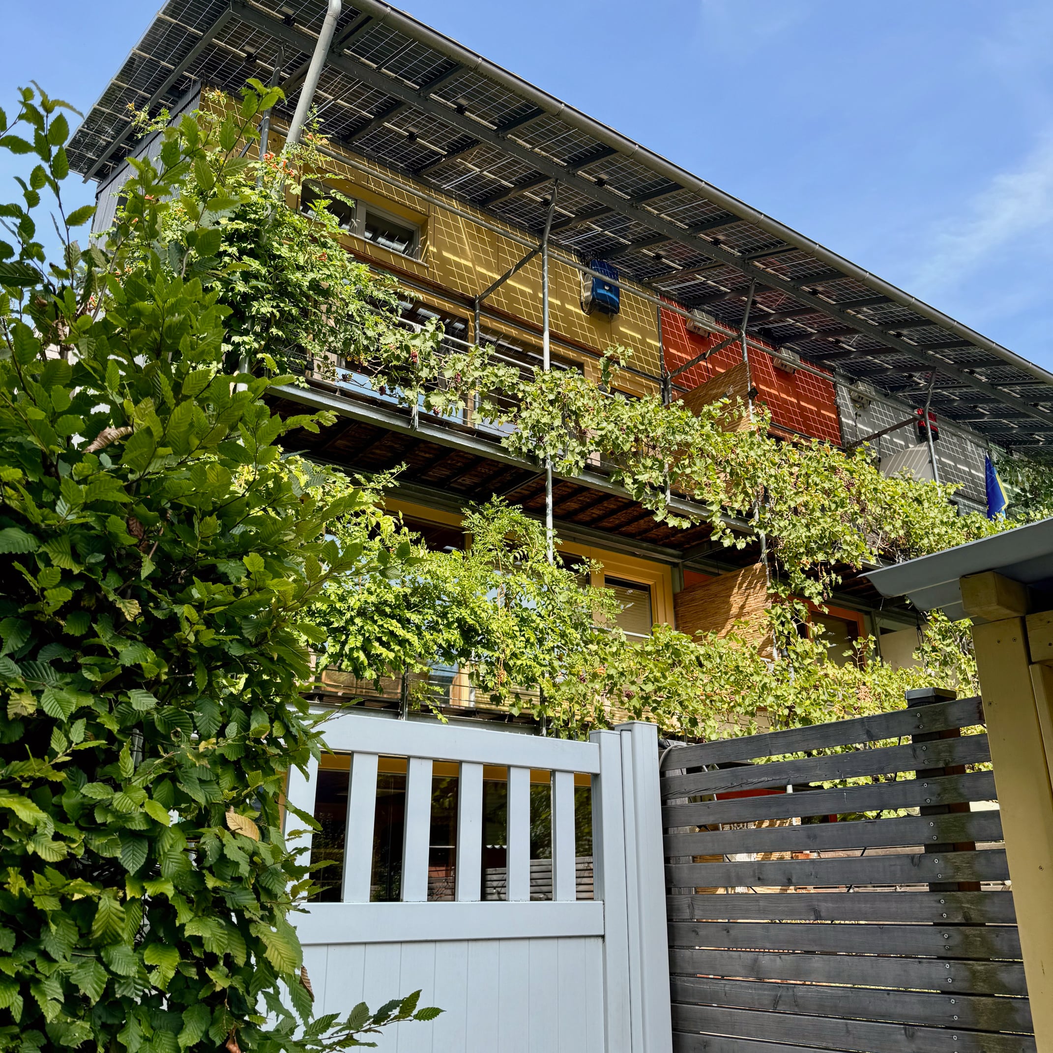 最後に小畑さんのご自宅に立ち寄らせていただく。緑豊かな庭やベランダを備え、カラフルな建物の屋根はソーラー・パネルだ。この辺りのヴォーバン地区は同じ建築デザインのパッシブ・ハウスが立ち並んでいる。小畑さんは環境保護に関心が高く、そのひとつが自転車であることが伺える。市内の自転車環境についても社会に働きかける活動家であり、そのより良いエッジ(境界)を拡げようとされている。