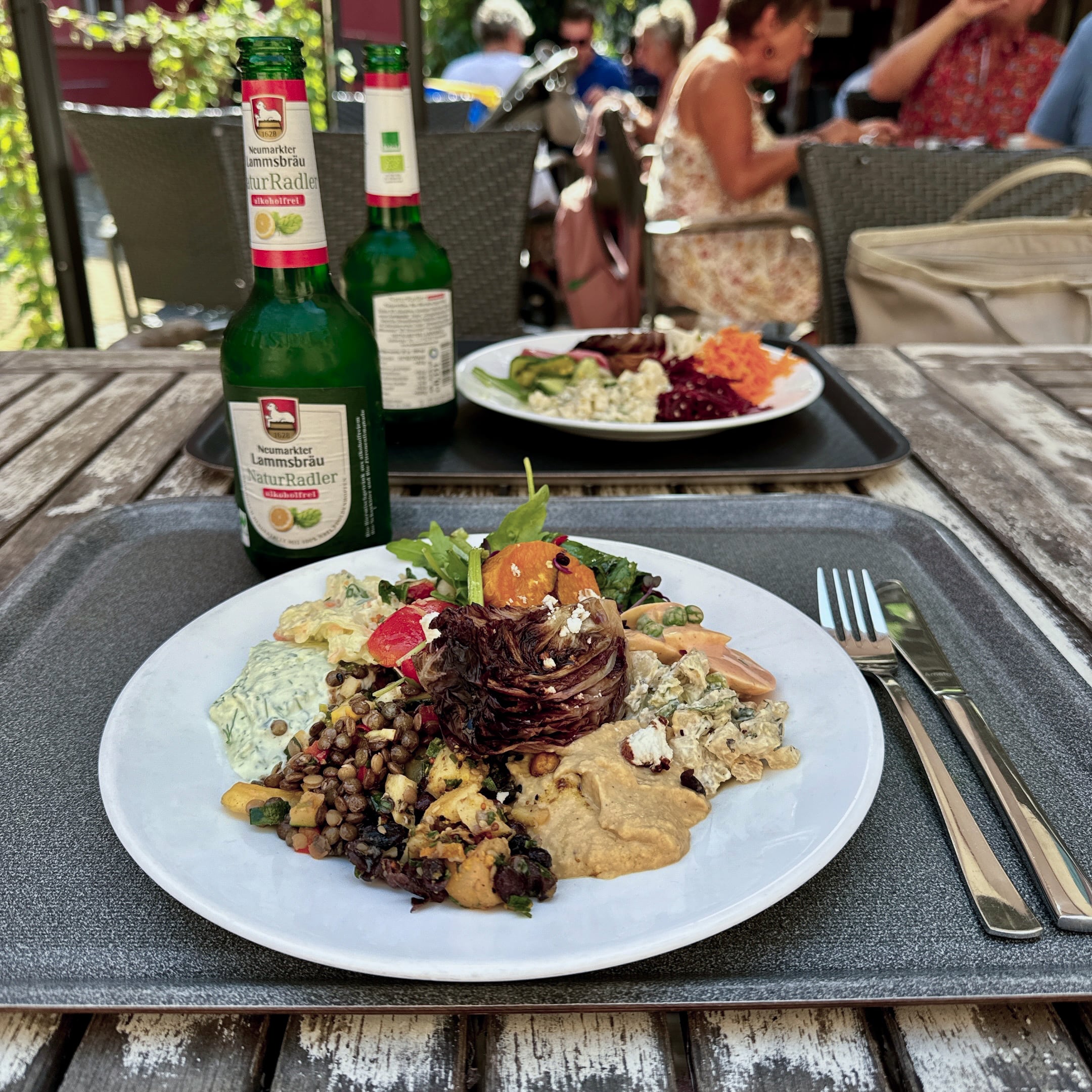 やがて旧市街に差し掛かり、その脇に自転車を停めて、そぞろ歩き。中世から続く古い街並みと石畳、300年かけて建設された大聖堂、ヨットを浮かべ足をひたす清流の水路(Bächle)など観光地として有名なだけあって、多くの人で賑わっている。パンからはみ出るソーセージ(Lange Rote)を頬張り、オーガニック・ランチにはラドラーを注文して一休み。