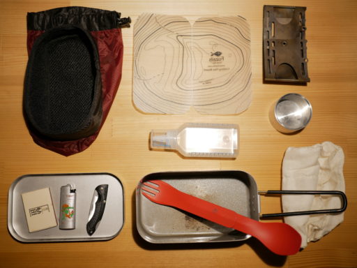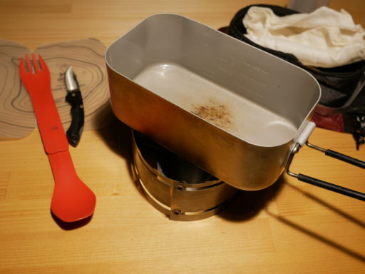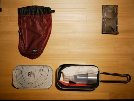上で挙げたアイテムは全てメスティンにまとめられる。まずインナーケースを配置、マッチをポン、RSR Stoveに挿したSKカップ付ボトル100ml(たぶん狙ったサイズ)を真ん中に寝かせ、脇にGoBites DUOを添わせる。ナイフとライターはカチャカチャ鳴らないよう布巾で包んで反対側の隙間に入れる。後は畳んだカッティングボードをはめ込んだ蓋を閉じればOK。風火蔵はハンドルの下に挟み、全体をケースに入れる。