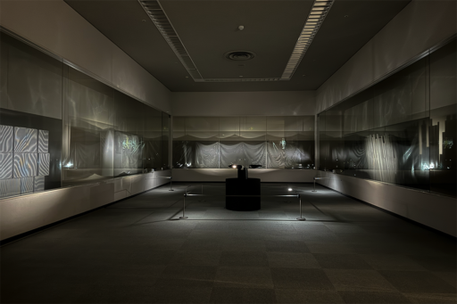 会場の中では唯一暗い部屋で鑑賞する「かんしょうこう」は、構成要素がシンプルな作品である。光と縞模様と白い物体に影が落ちている状況を観察することを促している。ガラスケースの中で風に揺れる布以外は、吊られたり置かれたりして静止している。水平に光を当てているため、物体表面の陰影を消し去ることを前提と設計している。その表面に縞模様とその影が落ちるため、縞と縞が干渉する状況を作っている。この現象は「モアレ」と呼ばれ、物体表面に沿って現れ、かつ鑑賞者の視点によって変化する。我々が日常見ている物の存在について、色や質感や機能といった暗黙知によって知覚しているが、一旦それらの情報を排除したときに起こり得る、物体を面のみで捉えている(面を目で触れるデッサンのような)体験を揺り動かしているのかもしれない。