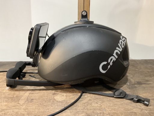車用のデバイスホルダーでスマートフォンをヘルメットに接着していたが、デバイスの重みにホルダーが耐えられなかったり、可動域に問題があり、それぞれの体験者に合わせてデバイスの位置を変更することが難しかった。
