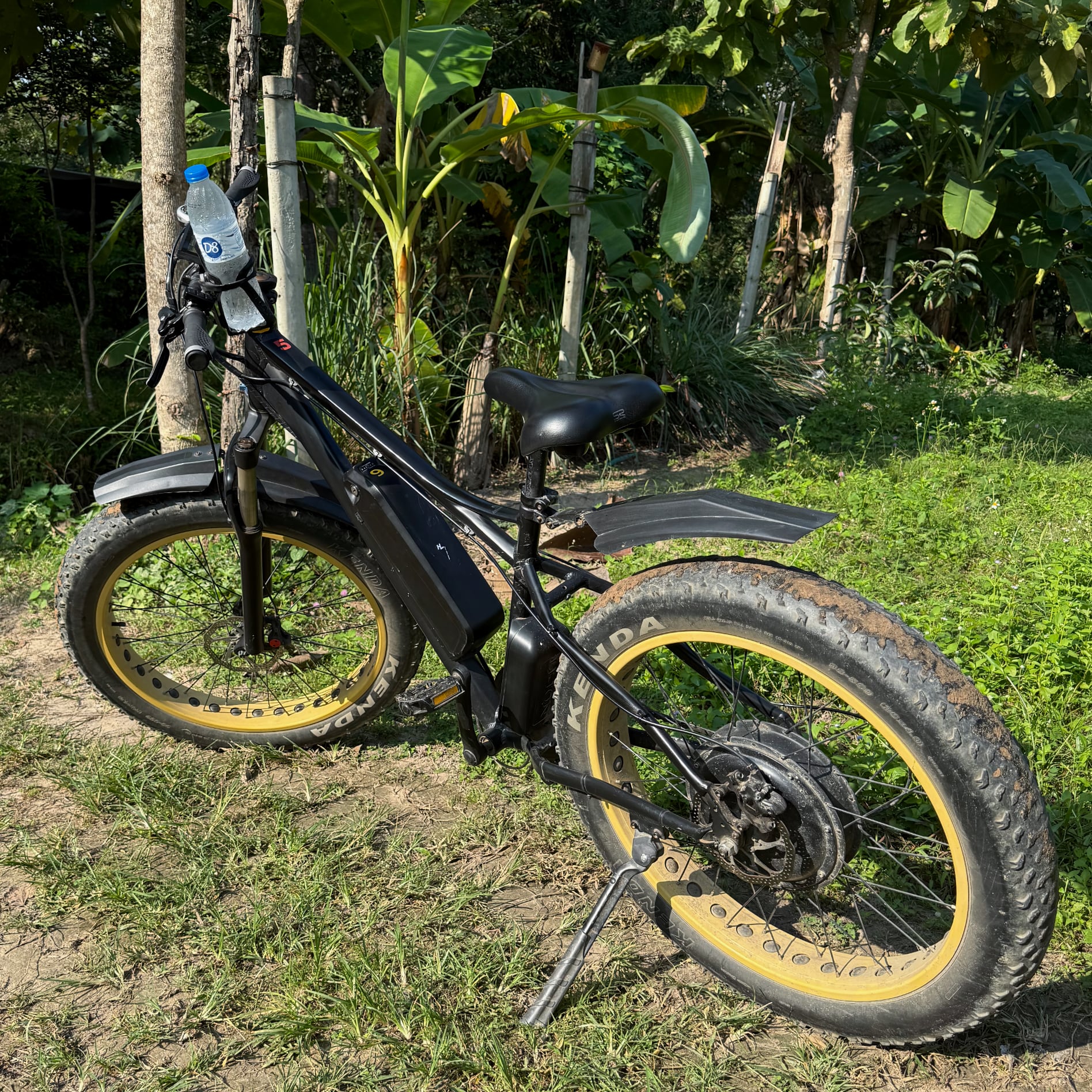また、自転車はフレームから電動アシスト・ユニットまで自分たちが選んで組み立て調整したそうだ。アシストは極めてパワフルなだけでなく、漕がずに自走することまで可能。尋ねても要領を得なかったので、タイでの規格や規制は緩いのかもしれない。かくして舗装道路なのにフカフカのファット・バイクで強力にドライブする極楽ツアー専用車の出来上がり。その自由奔放さが羨ましい。