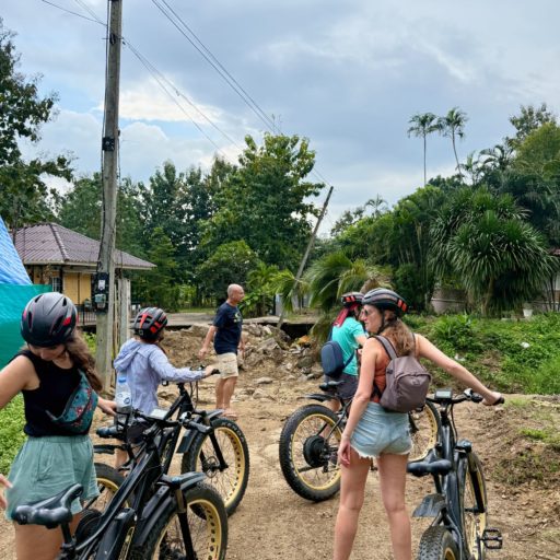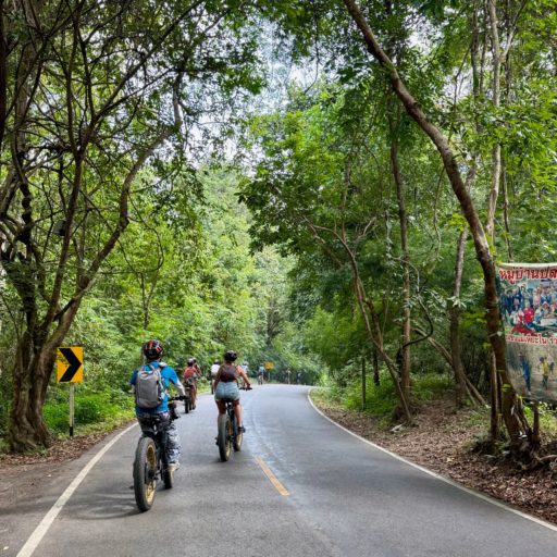 タイ、チェンマイの市街地は必ずしも自転車に適した走行環境ではなかった。そこで趣向を変えて、郊外の自転車ツアーを申し込んだ。その名も「Half-day hilly E-bike adventure (fully paved roads, GUIDED)」と実に軟弱そうなコースだ。朝にホテルに送迎車が来て、約20km離れた郊外のツアー事務所へ向かう。ここで数人と合流して、ガイドの先導でサイクリングに繰り出す。