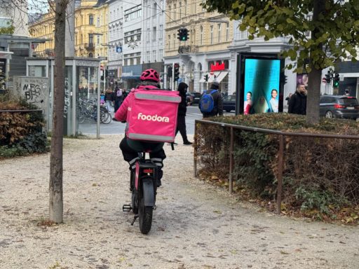 リンツの街の中で多く見かけるのは自転車によるフードデリバリーだ。のんびりメインストリートを散歩していると、時々すれ違う。