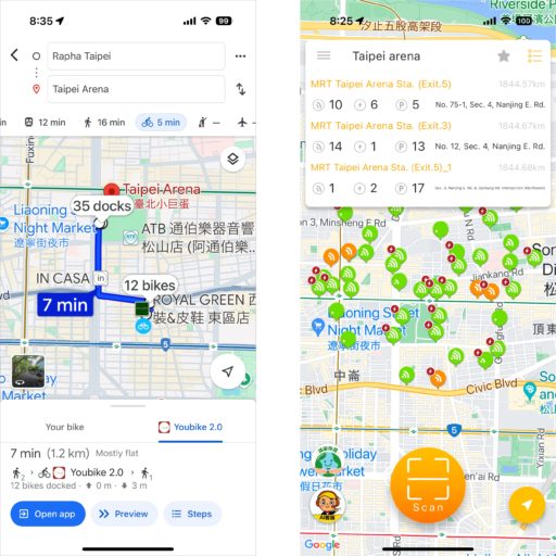 ナビゲーションとしてはGoogleマップが自転車に対応している。これにはYouBikeタブがあり、現在地と目的地に近いステーションを含めて案内してくれる。利用できる自転車の数と空いているスタンドの数も表示される。日本でも同様の機能が提供されている。一方、Appleマップでは自転車ルート検索ができなかった。悠遊カードもApple PayやGoogle Payに取り込めないらしい。