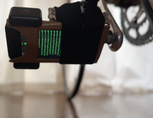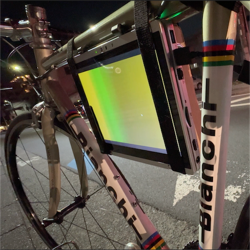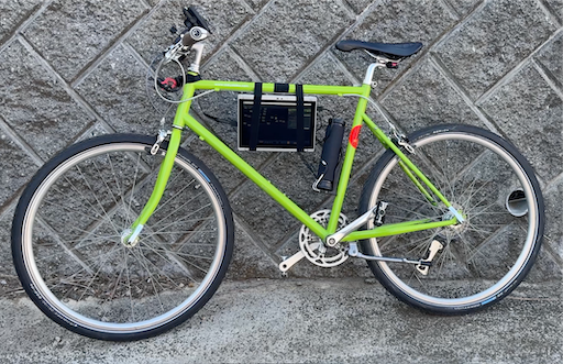 次に自転車本体への搭載を進めた。風の音とブレーキレバー操作音を拾うためのコンデンサーマイクを百均ショップで購入した自撮り棒でハンドルに括り付け、センサーとなるiPod Touchはペダルに縛り付けた。また本体となるPCはトップチューブにぶら下げ、いわゆる「前三角」と呼ばれるスペースに収めた。ボトルケージには円柱型のスピーカーを装備している。