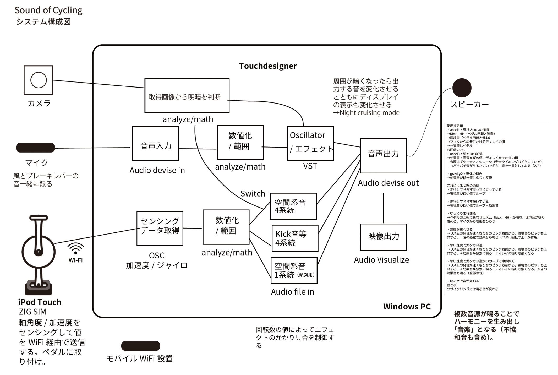 マイクから取り入れた風の音とブレーキレバー操作音には、うねりの効果が得られるエフェクト(フランジャー等)と音を反復させるディレイをかけた。ペダルに設置したセンサーは、車体の左右の傾き、軸角度、加速度を取得し、それぞれのパラメータに基づき設定したオーディオファイルとオシレーターによる発信音を再生させた。オーディオファイルは「空間系音源」として、デモ作成時に収録した風切音を加工した音を使用した。また「ビート系音源」としては、フリーで公開されているドラム音源のスネア、キック、ハイハット音を使用した。同じパラメータを基に、発音タイミングをずらすことで「ドン」「タッ」「チッ」とリズムを刻むようにした(一定のテンポで鳴らすのは困難であったが、それはそれで予期せぬリズムを生み出した)。また、PCに搭載されているカメラから取得した明暗のパラメータに沿って、暗くなったら鳴らす音色を変えるなどの小技を加えた。