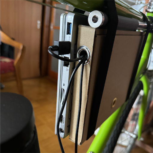 PCは折りたたんでタブレットとして使用するが、裏側はキーボードがむき出しになるため、カバーとして同サイズの段ボール空き箱を使用した。この箱はキーボードのカバーであると同時に、ケーブル類やモバイルバッテリー、ポケットWiFiの収納ボックスとして有用であった(ちなみにこの空き箱は「M5StickC Plus」が梱包されていたもので10インチのPCにジャストサイズであった)。