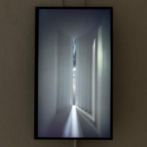 建築模型が外光を切り取り、それをさらに切り取るディスプレイの縁。空間の形状と自転車の運動方向によって制御された光は、空間の表面をなぞるように動きながら、ディスプレイの画面の中に収まっている。