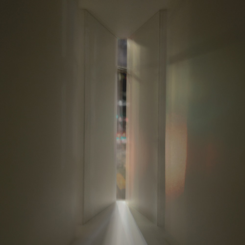 特徴的な縦型の開口部から上下に伸びる光が壁面を照らすという構造は変わらないものの、撮影するタイミングによってまったく違う表情を見せてくれる画面が面白い。まさに、都市のある一角から光だけを取り出したような感覚で、撮った一枚の写真からその場所のイメージが浮かび上がってくる。