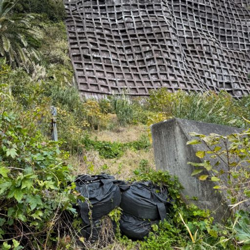 だが、洞輪沢漁港近くの特攻艇「震洋」の地下壕には近づけなかった。およその見当はついたものの、生い茂る草木の前は土嚢やロープで立入禁止となっていたからだ。他にも三原山山中の陸軍司令部壕跡など数多くの遺構があるらしい(調査レポート)。ただし、観光協会で尋ねても教えられないとの一点張り。破棄されたまま整備されておらず、安全が保障できないからだと言う。
