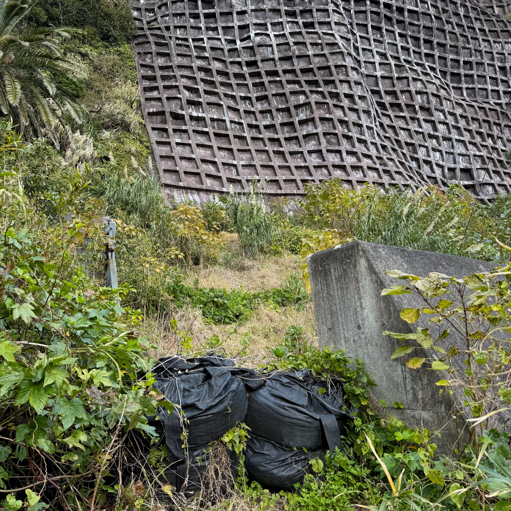 だが、洞輪沢漁港近くの特攻艇「震洋」の地下壕には近づけなかった。およその見当はついたものの、生い茂る草木の前は土嚢やロープで立入禁止となっていたからだ。他にも三原山山中の陸軍司令部壕跡など数多くの遺構があるらしい(調査レポート)。ただし、観光協会で尋ねても教えられないとの一点張り。破棄されたまま整備されておらず、安全が保障できないからだと言う。