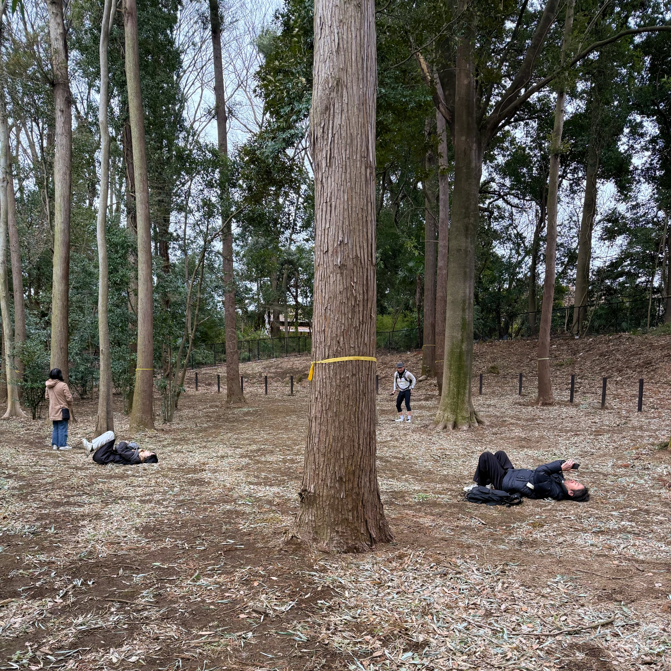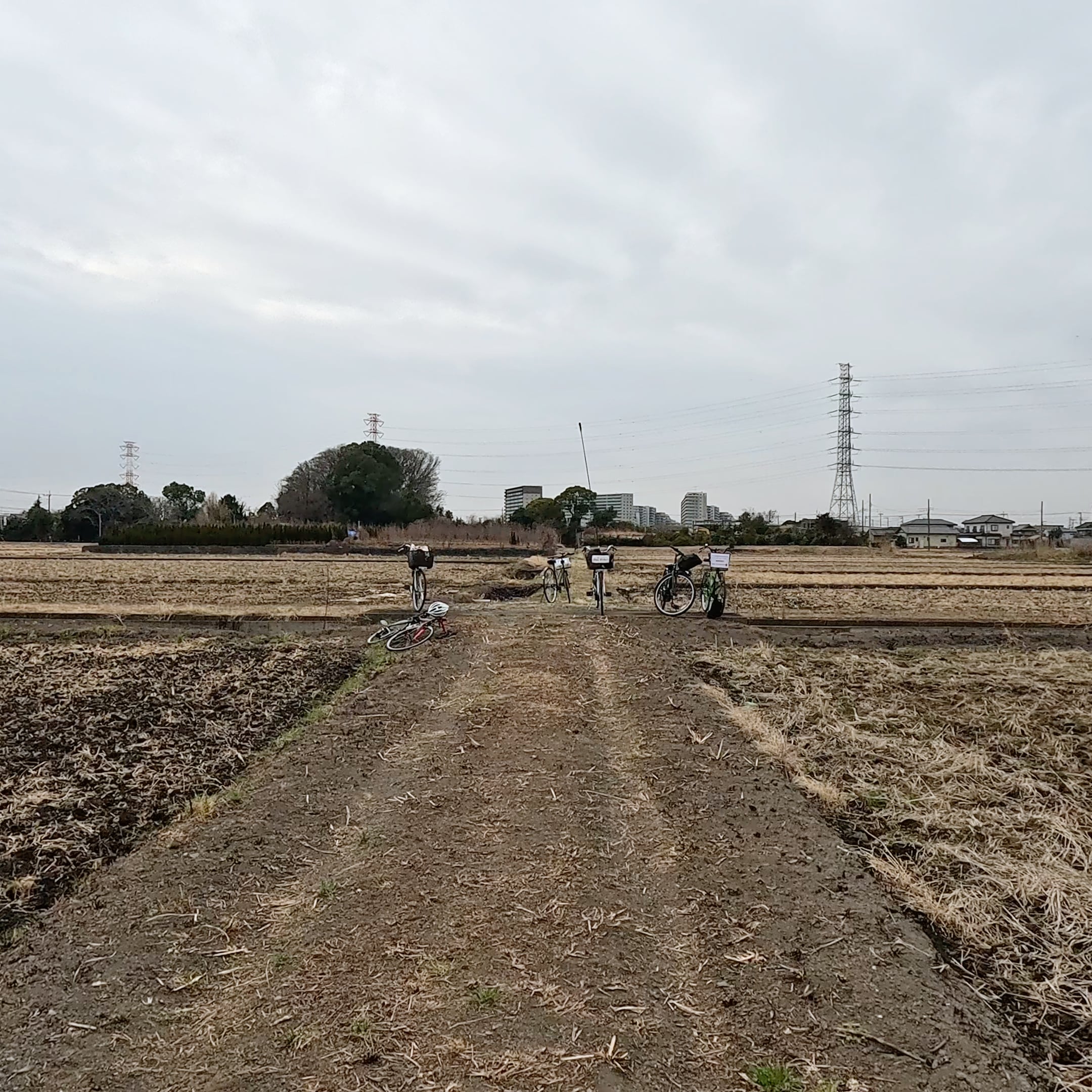先導者に率いられた数人の自転車旅団は住宅地から郊外へ抜ける。田園、市街地、高架道路、川辺、森林公園などを巡っていく。その先々で自転車を停めて語りに耳を傾け、仮想物体を見やる。音声が簡単な身体動作をいざなう。時間と空間を行き来し、内省と希求を漂う。曇り空のもと、冷たい風に雪が舞い始める。疲労を感じ始める頃には、どこからか軽快軽妙なチャイニーズ・ポップが聞こえてくる。