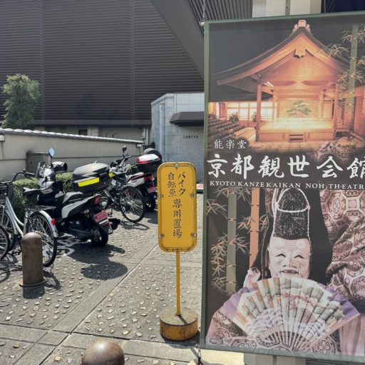 観世会館に到着すると、駐輪スペースは美術館のものよりもずっと簡素なものだった。建物の通路脇に設けられた駐輪エリアであり、バイク置き場と共用になっている。しかし、その簡素さが逆に能楽という古典芸能の本質的な「引き算」の美学と調和しているのかもしれない。むろん、これは京都特有の言い回しと受け取ってもらっても構わない。