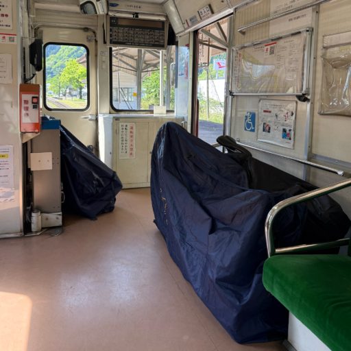 まずは長良川鉄道の関駅から輪行開始。朝の一便だけサイクル・トレインがあるものの、タイミング的に利用できなかった。ただ、駅で輪行袋を借りられるのは有り難い。車両の前方と後方に自転車を置くスペースがある。我々の4台の他に家族連れも4台ほど載せていたので賑やかな雰囲気。休日だからか乗客も多い。こうして一両だけの可愛らしい列車は長良川の上流に向かって出発する。
