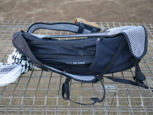 本体を身体に密着させず、かつ安定させるメッシュパネルはハイキング用のパックでもちらほら採用されている。ただ、20リットルに満たない(比較的)小容量のモデルは珍しいと思う。モンベルからもかつて似た製品が出ていて、そちらも愛用していた。しばらくこのタイプのものを使っていなかったので「バックパック=背中がすぐ熱くなる」とのイメージが自分の中で固着していたのだが、Race Air 10を買ってみて、夏場でも普通のバックパックとは快適性が別物だと認識を再更新することになった。