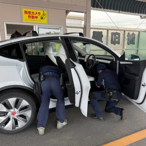 次に封印場にクルマで移動。ここで書類を渡せば係員が自動車登録番号(ナンバー・プレートの番号)と車台番号(車両に刻印する識別番号)を確認した上で再封印が行われる。これもあっけないほど簡単。もっともテスラの車台番号は特殊とのことで、二人がかりで探すのに苦労されていた。筆者のモデルY(上海ギガファクトリー製)は運転席のカーペット下にあった。