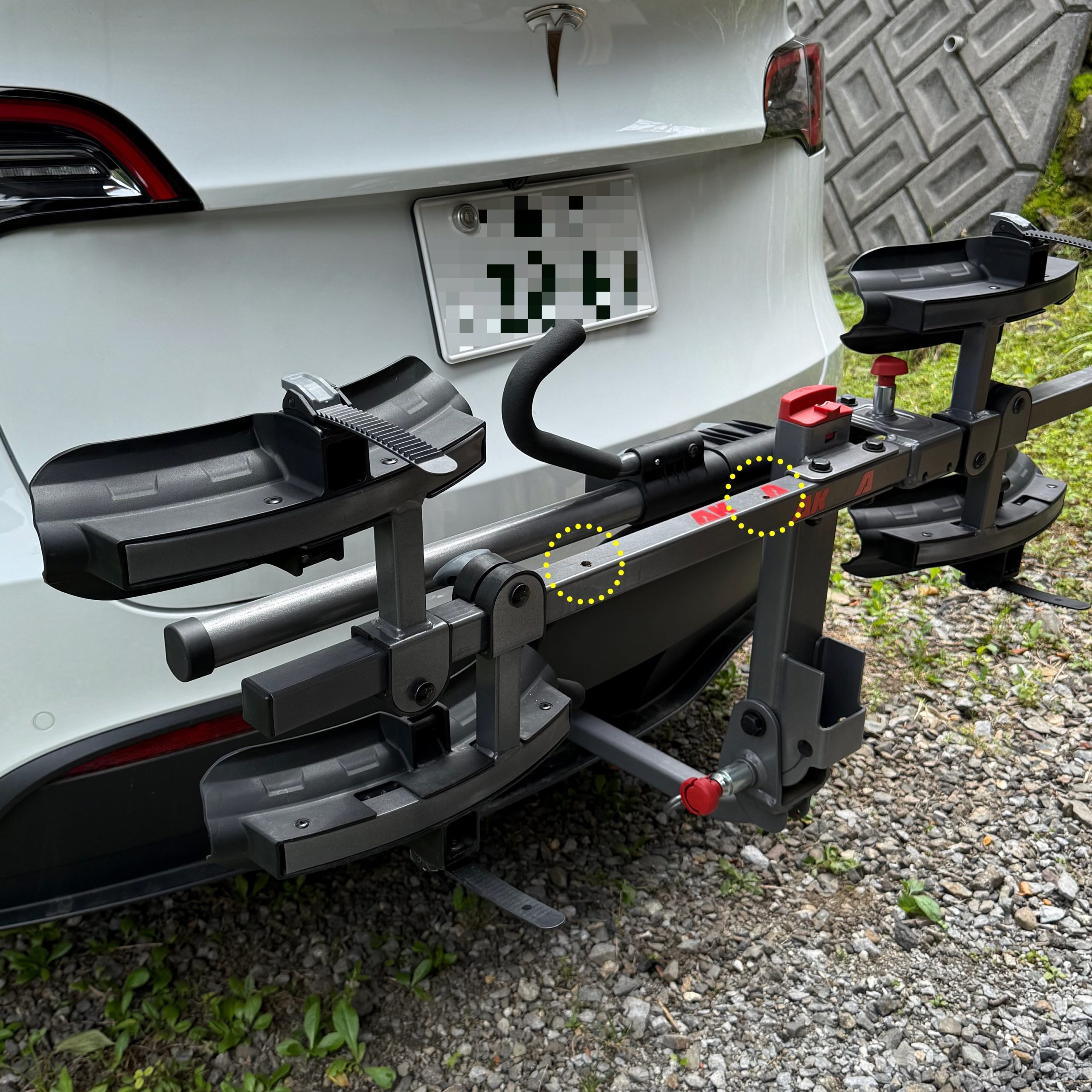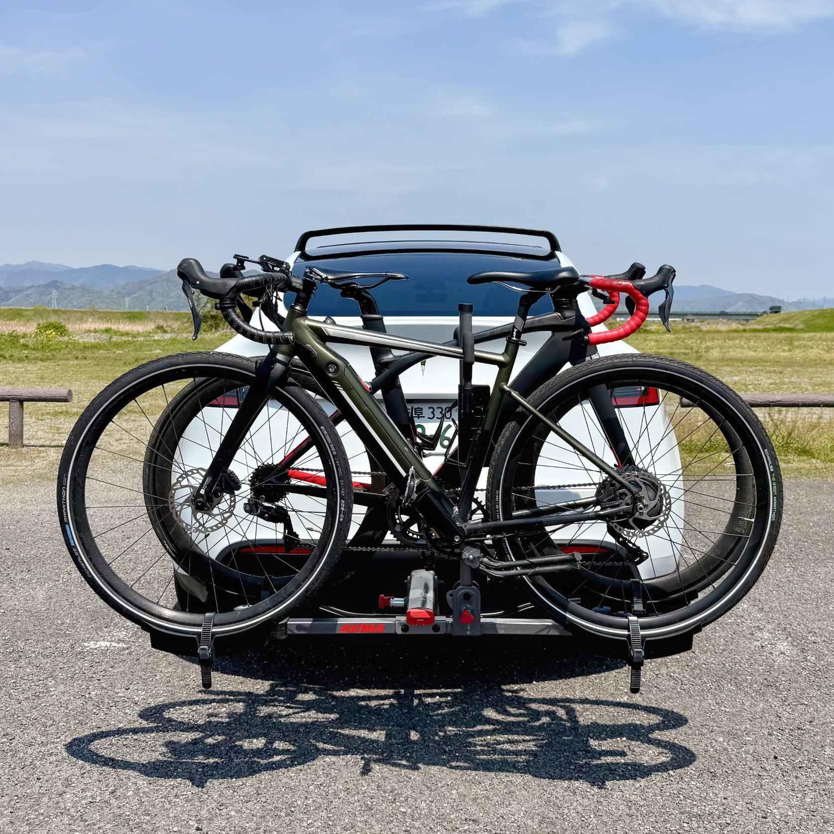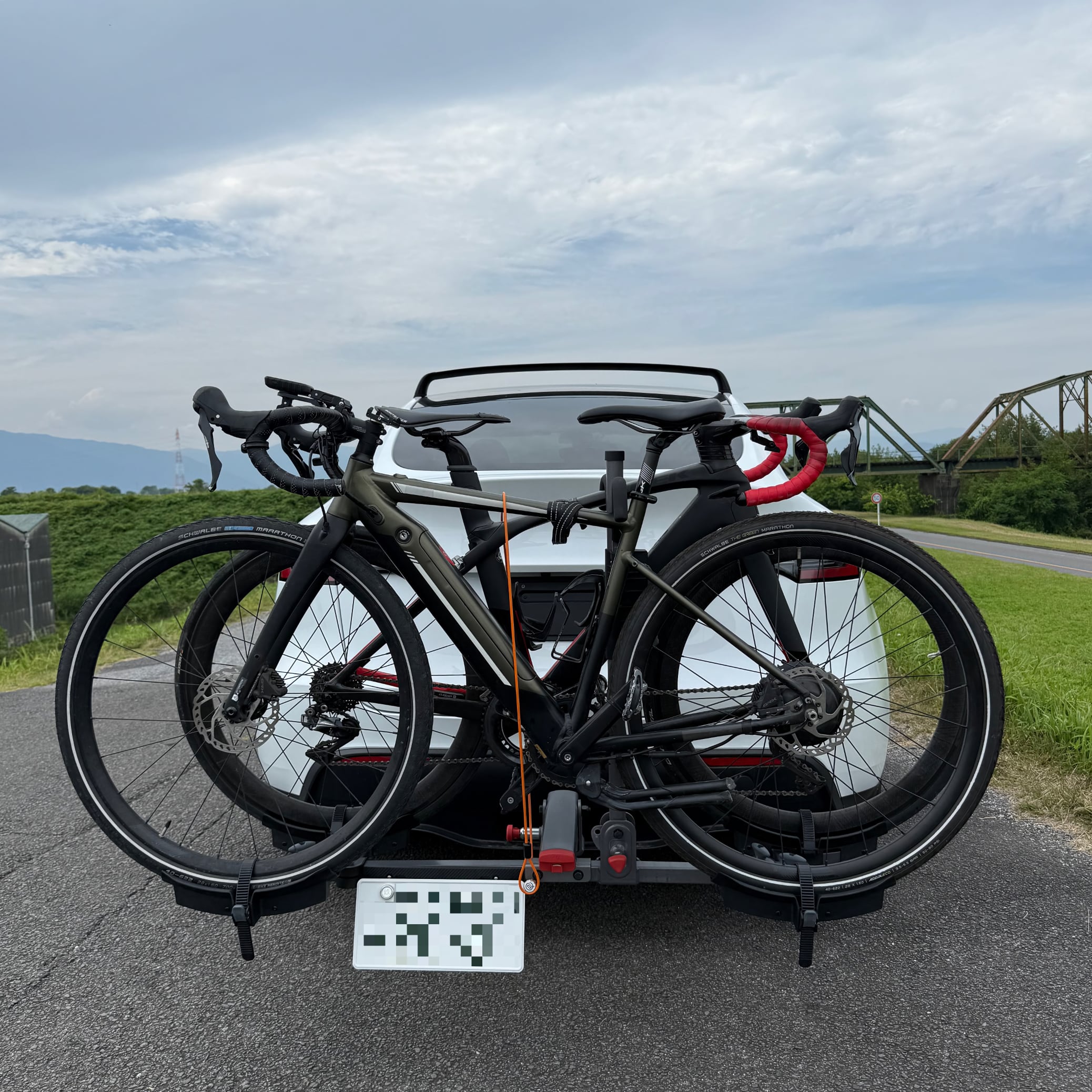 ともあれ、これで自転車を手軽に載せることができる。ルーフ・キャリアでは辟易する重たい電動アシスト自転車でも少し持ち上げるだけで済む。これぞ快楽原則だ。自転車の固定も中央のアームをフレームまで下げ、車輪をストラップで締るだけ。慣れれば1分で済む。ところが、1台ならともかく、2台の自転車を載せるとナンバー・プレートが見えにくくなる。これでは道路運送車両法違反になりかねない。