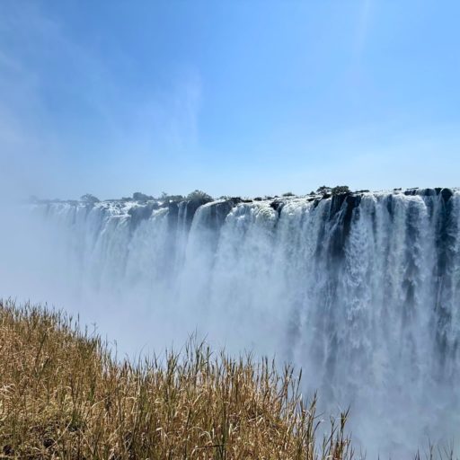 一般にヴィクトリアの滝はジンバブエ側の方が見応えがあると言われている。確かに構成や構図として変化に富んでいる。ただ、こちらも大半は水浸し。得難い体験ながら、次第に感覚が麻痺してくる。ヴィクトリアの滝は切り立つ狭い渓谷に注ぎ込むので水煙が激しい。しかも渓谷は7つ連なり、何万年もかけて滝が移動した痕跡と言う。すでに次の渓谷が形成されつつあり、壮大な水時計と呼びたくなる。【映像】