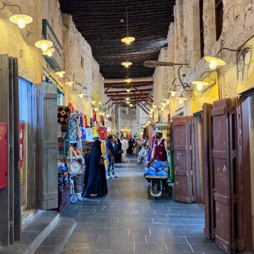 途方に暮れながら歩き続けて公園を抜け出し、脱水症状気味でカフェに辿り着く。当初は自転車で市内を回るつもりであったものの、この炎天下では無謀だと悟る。自転車は気温が下がる夕方までお預け。そこで近くの伝統市場スーク・ワキーフ(Souq Waqif)へ。狭い路地も日陰なら少しだけ涼しい。伝統的なカタール建築ながら、近年焼失して再建されたらしい。カタール料理のランチは可もなく不可もなく。
