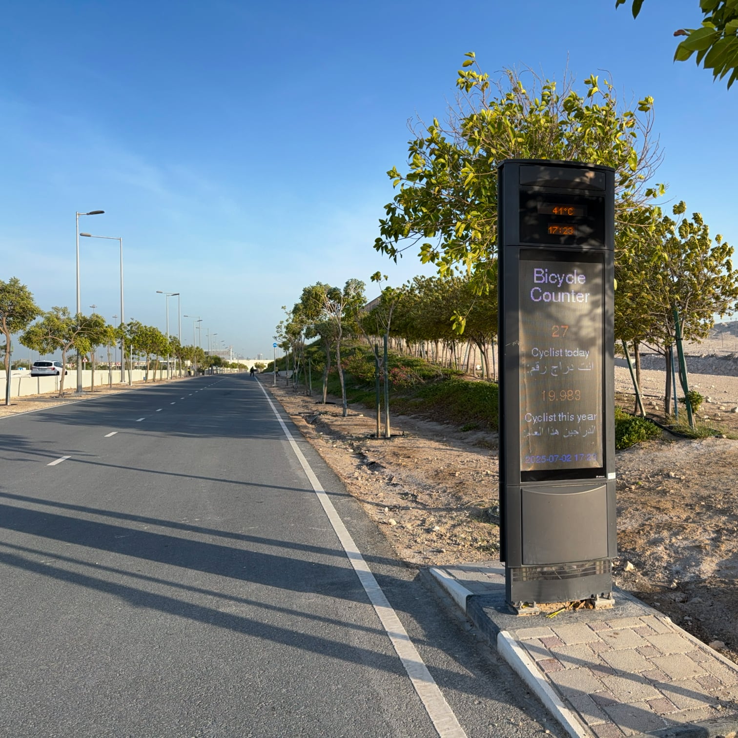 地下鉄の駅から地上に上がって驚いた。朝なのに気温は40℃近い。眩い陽の光に照らされ、乾いた熱風に吹かれながら歩き始める。美しく整備された広大なアル・ビッダ公園(Al Bidda Park)は、清掃員以外は誰もいない。隣接する道路には大量のクルマが行き交っている。なんとか辿り着いたレンタル自転車ショップは開店が夕方だと知る。WEBサイトには営業時間がなく、Googleマップの情報は間違っていた。
