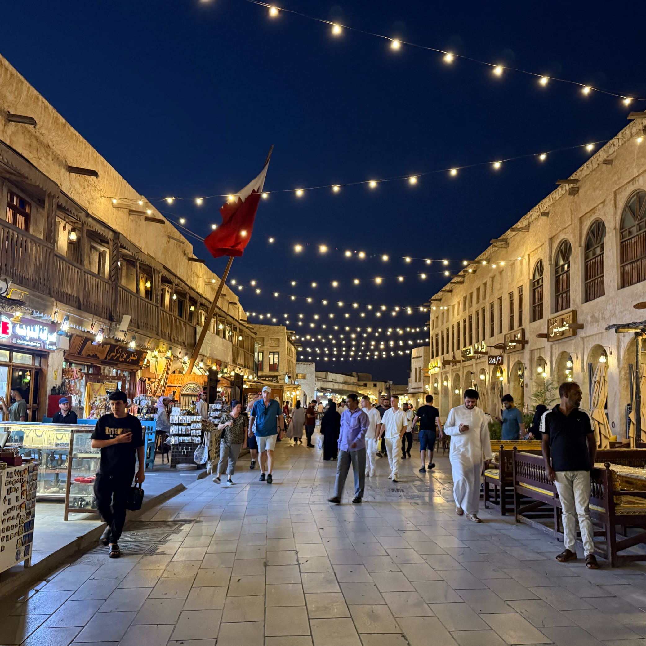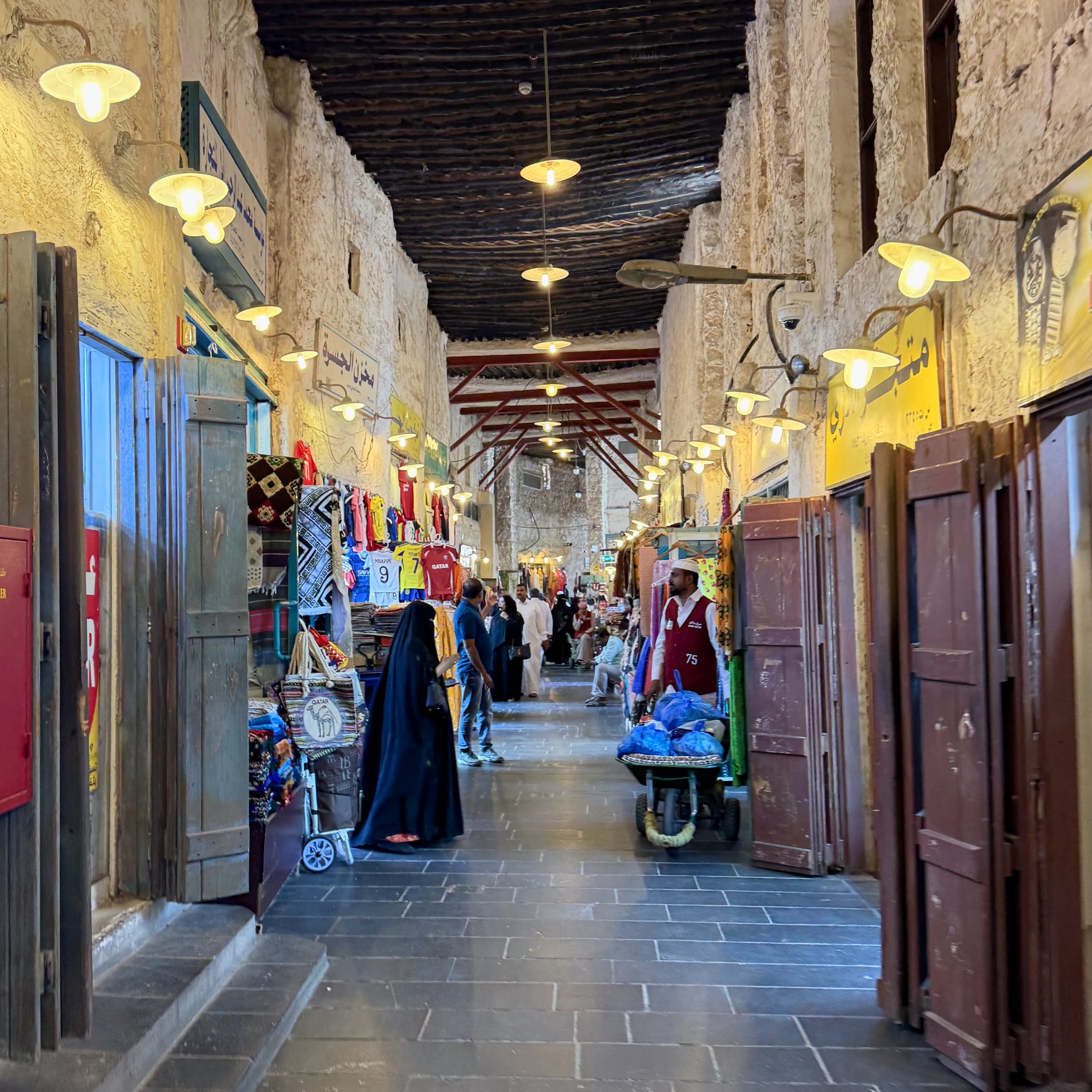 途方に暮れながら歩き続けて公園を抜け出し、脱水症状気味でカフェに辿り着く。当初は自転車で市内を回るつもりであったものの、この炎天下では無謀だと悟る。自転車は気温が下がる夕方までお預け。そこで近くの伝統市場スーク・ワキーフ(Souq Waqif)へ。狭い路地も日陰なら少しだけ涼しい。伝統的なカタール建築ながら、近年焼失して再建されたらしい。カタール料理のランチは可もなく不可もなく。