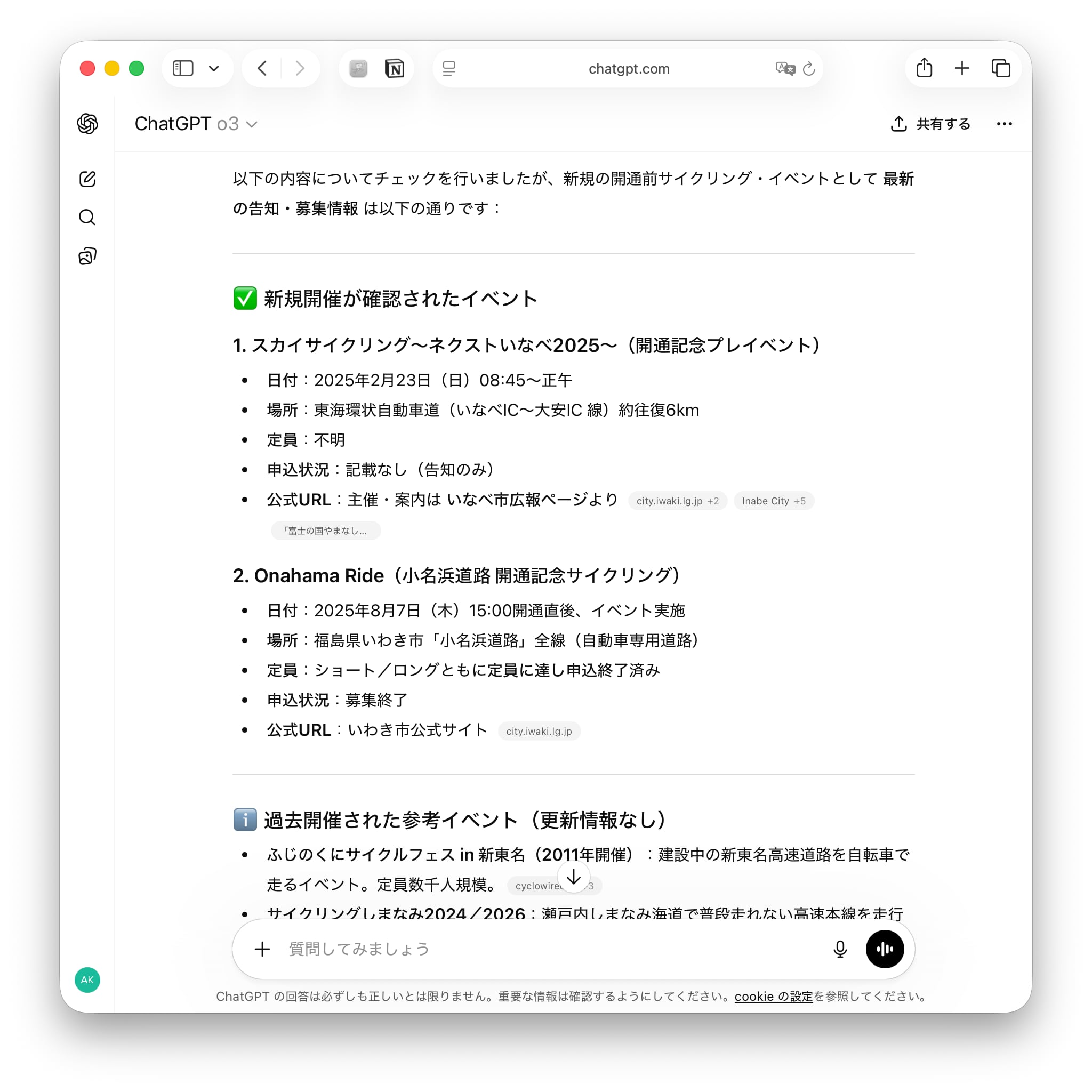 さて、この手のイベントの開催を事前に知ることは難しい。実際にも近隣での開催を後で知って悔しい思いをしていた。そこでChatGPTのScheduled Tasksを設定、週間に1度の割合で自動車専用道路での自転車走行イベンを探す。いわゆるエージェントによる自動検索だ。当初はハルシネーションが発生していたものの、次第に精度が良くなり、遂にはOnahama Rideを見つけてくれた次第。これぞお手軽な快楽。