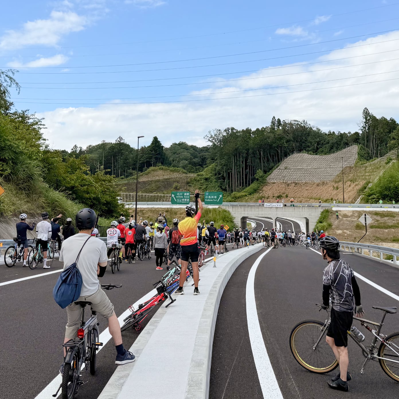 福島県の小名浜で2025年8月3日、つまり本日、開催されたOnahama Rideに参加した。これは自動車専用道路として開通する小名浜道路を開通前に自転車で走行するイベント。直線とクロソイド曲線を活かした真新しい高品質舗装道路が開放される貴重な機会だ。この日は連日の猛暑がおさまり、やや涼しく感じられる絶好の気候。多くの参加者とともにインターチェンジから緑豊かな山間の本線に乗り込む。