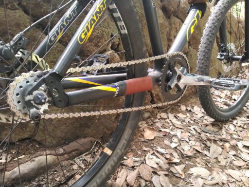テンションをよりよくしようとすると、パーツが一般に流通している組み合わせとしては、34/15(2.27)、36/17(2.12)、38/19(2.0)あたりが候補になる。チェーンリングがいよいよMTBらしくない大きさになっていいなら、39/20=1.95(半コマ使用)と40/21=1.90も視野に入る。30/15の時にギア比は悪くない印象だったので、今度は38/19を試すことにした。結果、テンションはようやく良好といえる範囲に収まってくれた。