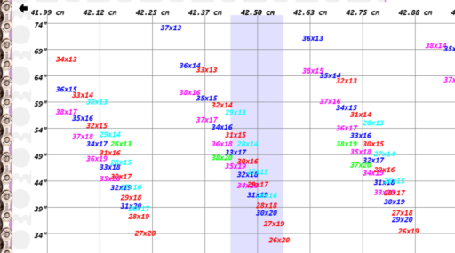 意を決してチェーンを新品に交換してみると、それまで程良いテンションが出ていた26/20は、見事にギチギチで使えなくなった。へたったチェーンでもギチギチだった30/16の方のコグを1T小さく(15に)してみると、こちらは外れるほどではないものの、ゆるい。どうやら自分のMCMのチェーンステイは425mmより長く、427.5mmより短いらしい。