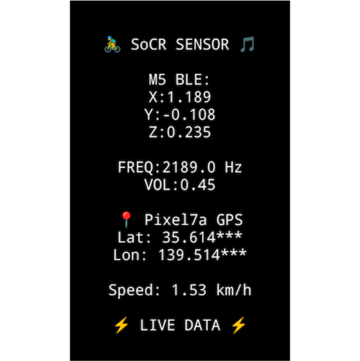 基本の基本の基本とは「センサーで取得したリアルタイムで変化する数値を、本体端末側で受け取る」である。M5StickからのXYZ軸の数値、またAndroid端末自体の速度値(GPS値から算定)を、ディスプレイに表示するところまでできた。